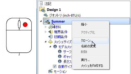 既に説明したように、Upfront CFD の目的は設計最適化によって製品の進化を図ることです。ここまでは、夏季シナリオを設定するプロセスについて説明しました。この作業を繰り返して冬季シナリオを作成するのではなく、夏季シナリオをクローン化して、異なる設定のみを変更します。