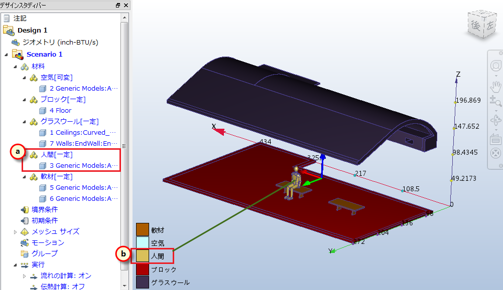 このステップでは、人間の熱物理特性をシミュレートする材料を利用者に割り当てます。インストールされている既定の材料データベースには、実際の「人間」の材料は含まれていないため、ここでは、類似物としてシリコンを使用します。より厳密にするには、人間の実際の特性値で材料を作成し、それをカスタムの材料データベースに追加してください。