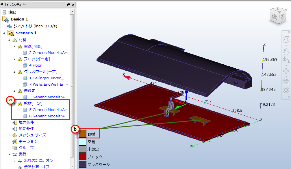 - a. デザイン スタディ バーで、[軟材]の部分に対する材料の設定を確認します。