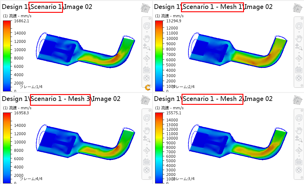 このステップでは、シナリオ間をアニメーション表示する代わりに、複数のビューポートで流速フィールドを横に並べて比較します。