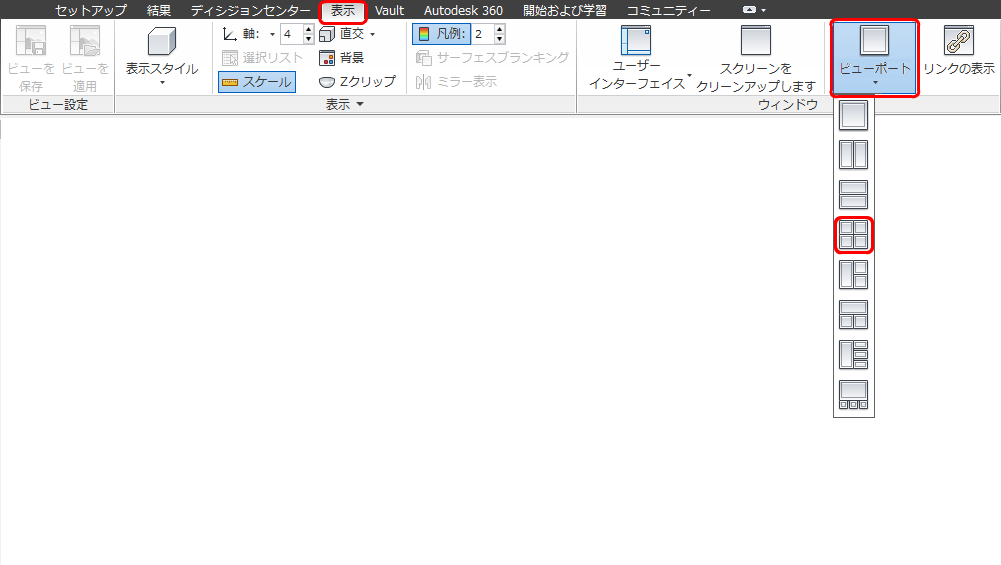 4つのビューポートを表示するには、表示タブでビューポートをクリックし、4を選択します: