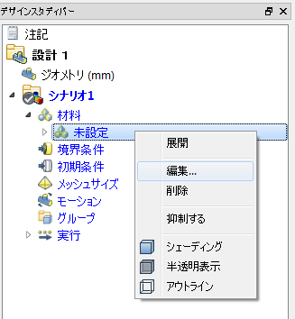 モデル内のすべての部品に材料を割り当てることからはじめます。次のいくつかのステップでは、材料の割り当ての一部を変更するかもしれません。このステップは解析を開始する前に、すべての部品に材料を確実に割り当てるのに便利な方法です。