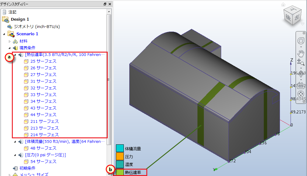 15. 熱伝達率境界条件が外側サーフェスに適切に適用されているかどうかを確認するには、デザイン スタディ バーとサーフェス上の色付きのストライプを確認します。
