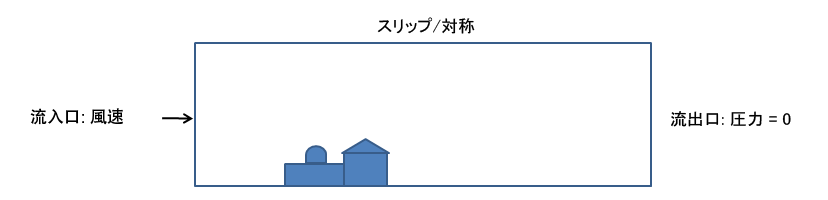 - 空気領域が開放された環境(風洞ではない)をシミュレートするものである場合、領域の上側と側面に スリップ/対称 条件を適用します。(地面には条件を指定しないでください。空気は物理的に地面に沿って流れないためです。)