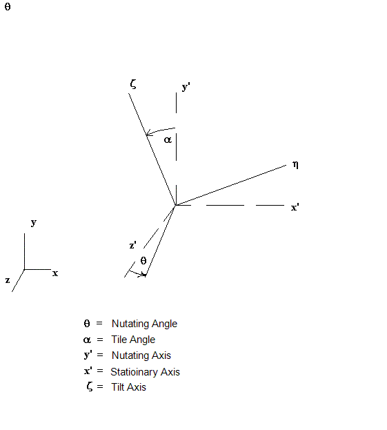 傾斜軸はディスクの法線であり、傾斜角度を保ちつつ章動軸まわりに回転する。章動運動の回転軸は、通常、直交座標系の軸であるが、これと同じである必要はない。章動運動の中心は、一般的にディスクの中心である。この中心点は、しばしば原点、あるいは容易に定義されるその他の点に作成される。上図に表示されるその他の量は、自動的に決定され、明示的に定義する必要はない。