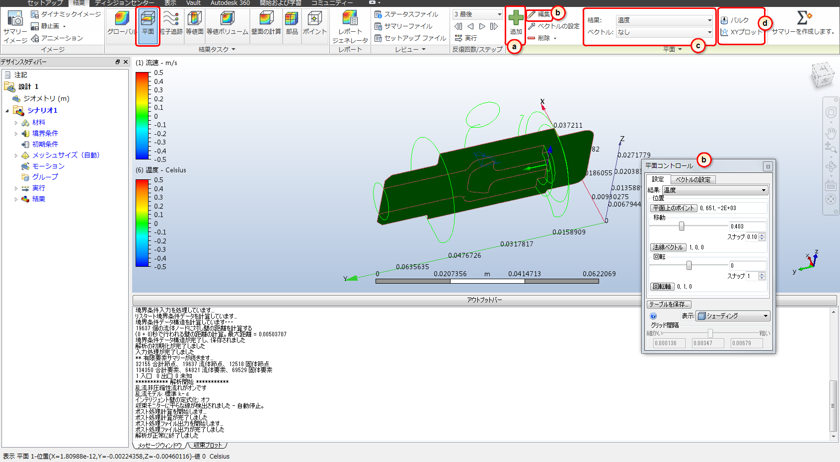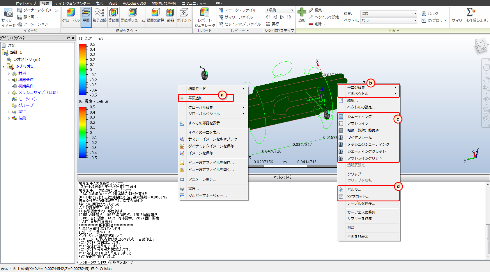 結果を直接モデル上に表示するには、[平面]および[等値面]を使用します。
