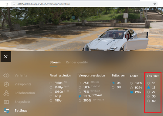 VRED Stream アプリ: レンダリングされたイメージのライブ ストリーミングを可能にするための改善機能として、このアプリを VRED アプリに追加しました。基本設定で Web インタフェースをアクティブにして、VRED アプリを起動したら、ブラウザで URL として localhost:8888 を指定してください。