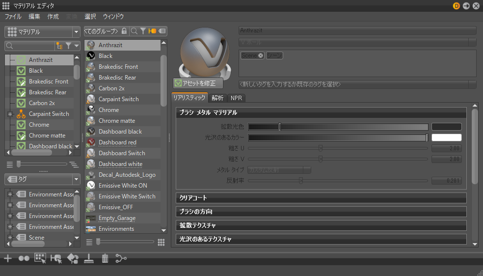 新しいサービスとクラスの詳細については、Python マニュアル([ヘルプ] > [Python マニュアル] > [VRED Python API v2])も参照してください。新しいマテリアル エディタでは、複数のマテリアルを同時に選択し、選択全体の値を 1 回で変更できるようになりました。たとえば、選択したすべてのマテリアルの拡散光色を同時に変更できます。複数のマテリアルにオーバーライドを設定することもできます。