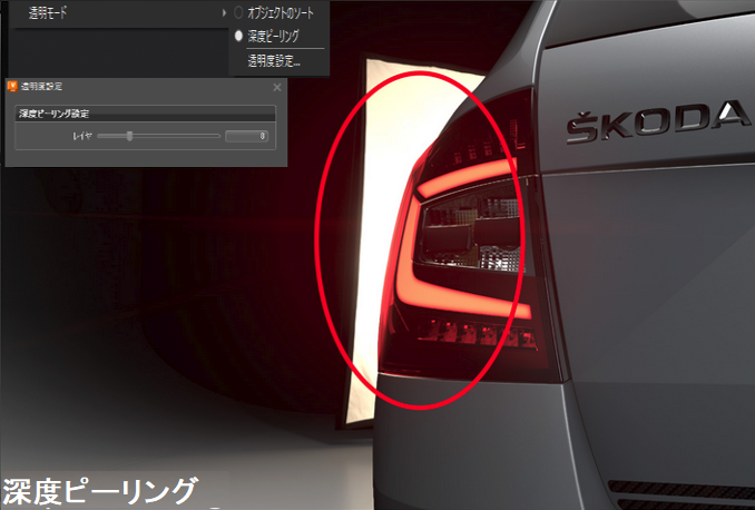 OpenGL で自己交差する透明なオブジェクトに対するピクセル補正用に、[深度ピーリング]を[オブジェクトのソート]に追加しました。これにより、透明なマテリアルが間違ってソートされる問題も解決されました。スライダを使用して、計算に使用するレイヤの数を調整します。