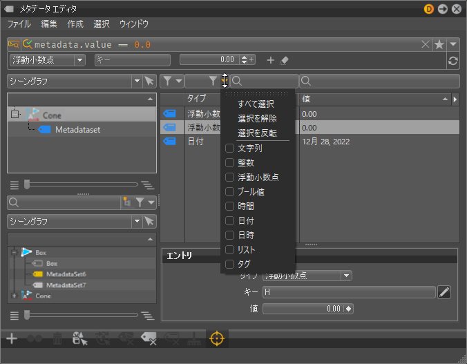 この仕組みについて説明します。メタデータ情報を使用することで、ノードの名前を知らなくても、ノードを検索してフィルタできるようになりました。この処理を行うには、新しい高度な検索ウィジェットを使って、メタデータ情報を検索する単純な Python 式を使用します。たとえば、特定の所有者や作成者などを検索できます。このように、自分の名前を探します。数百のノードが表示されます。さらに指定して、検索に日付を追加することもできます。これで、この特定の日に作成したオブジェクトのみが表示されました。