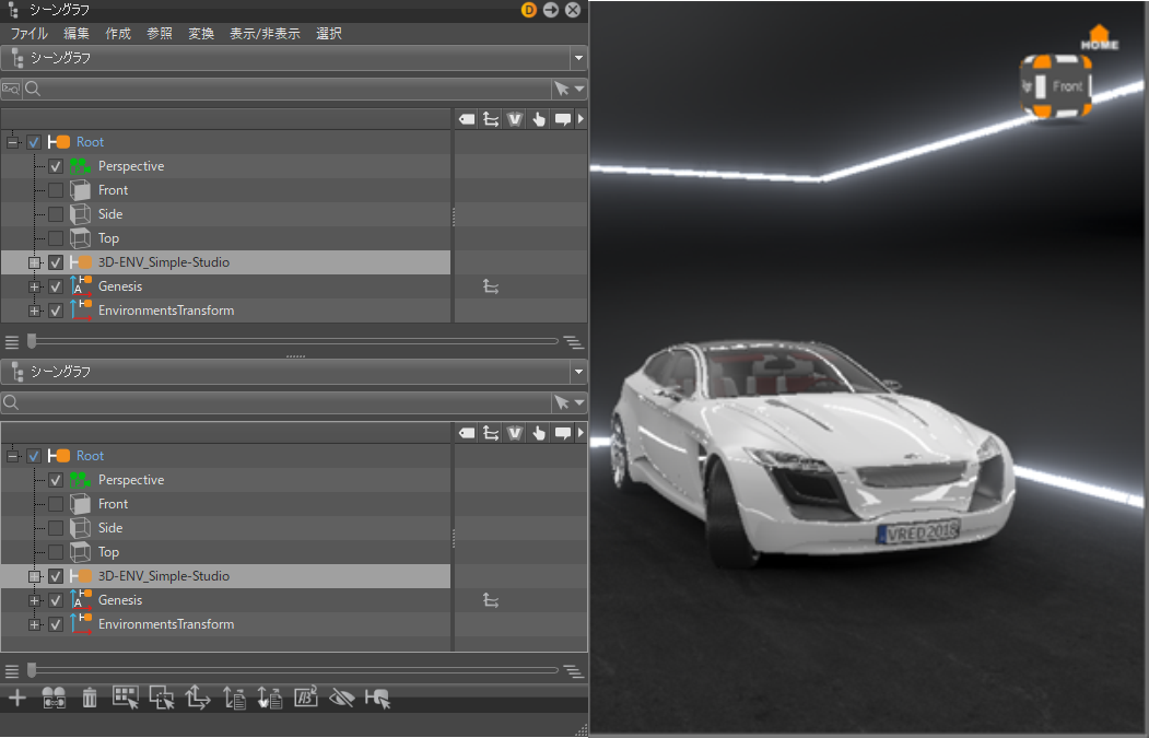 これで、メタデータ セット内のノードの可視性をコントロールする Python スクリプトを使用できるようになりました。これにより、ジオメトリ スイッチ内のノードを再配置しなくても、さまざまな自動車のバリアントを表示できます。この方法でシーングラフの複雑さを大幅に軽減できるため、自動車のバリアントの切り替えが非常に複雑な場合は、さらに便利です。