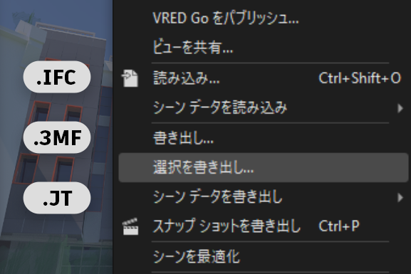 2 番目のファイル形式は、IFC (Industry Foundation Classes)です。これは、建物および土木インフラストラクチャ データを含めることができる業界標準です。IFC は建築分野で使用され、BIM プロジェクトなど、多数のさまざまなチームのクロスプラットフォーム ワークフローで使用されます。つまり、IFC 形式を使用すると、Revit データを VRED に簡単に取り込むことができます。これにより、Revit ファイルを FBX に書き出す場合と比較して、はるかに良い結果が得られます。さらに、マテリアルやメタデータなどの追加情報をロードすることができます。