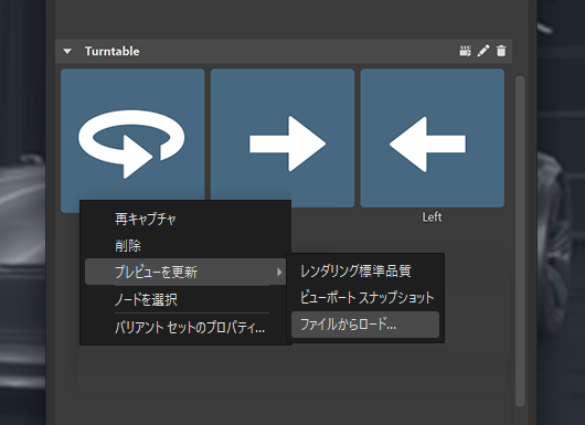 たとえば、カスタム イメージ ファイルをロードして、それらをバリアント セットのサムネイルとして使用できるようにしました。これは、プレビューのサムネイルがバリアント セット内で正しく表示されない場合に非常に便利です。この例のように、フード アニメーションのサムネイルを少しわかりやすくしました。また、他のユーザがシーンファイルを使用している場合にも非常に便利です。