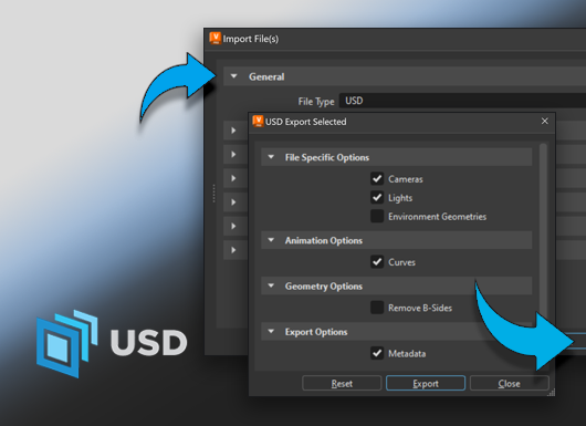 さらに、USD ファイルの読み込みと書き出し機能が実装されました。これにより、自分のパイプライン内だけでなく、さまざまなプラットフォームやチームと連携する場合にも、豊富なオプションと機能を利用できます。たとえば、Maya などの異なるアプリケーションとデータを交換することができます。USD 形式のオプションの詳細については、ドキュメントを参照してください。
