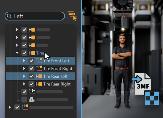 ワークフローを持つ異なるチーム間の相互運用性を高めるために、3D プリントの業界標準である 3MF ファイル内のテクスチャのサポートを追加しました。さらに、カラーが添付されたプリント ファイルを VRED で直接視覚化できるようになりました。たとえば、このスキャンは私自身のものです。また、このエンジニアリング パーツのシミュレーション結果を使用したこのようなスキャンもあります。