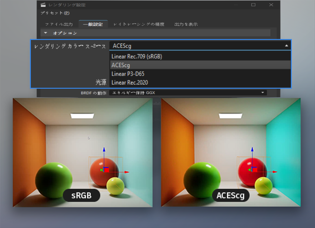 また、AgX カスタムと呼ばれる新しいセンサー応答ドロップダウンにより、指数と彩度の両方をコントロールする際の作業が楽になりました。通常の SRGB カラー スペース外のカラーを処理し、より広い色域を使用する場合は、[レンダリング設定]内で別のレンダリング カラー スペースに切り替えることができます。これにより、たとえばハイ ダイナミック レンジの出力コンテンツを処理する場合などに、柔軟性が大幅に向上します。
