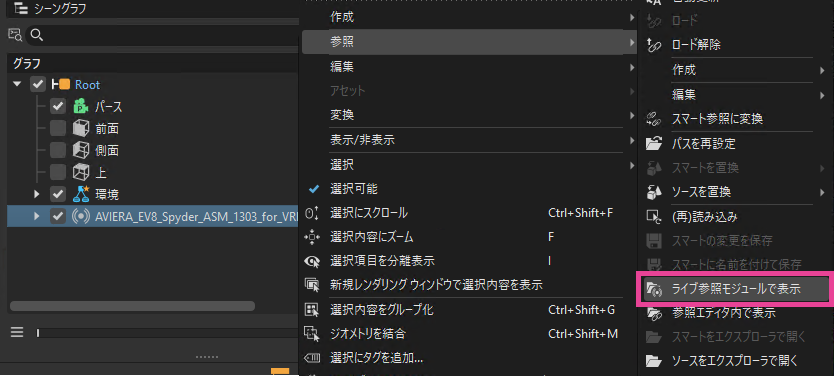 参照ノードを見つけやすくするために、[シーングラフ] > [参照]コンテキスト メニューに[参照エディタ内で表示]を追加しました。これにより、ファイルが選択およびハイライト表示された状態で参照エディタが開きます。ファイルに関する問題のトラブルシューティングを行う場合に使用します。