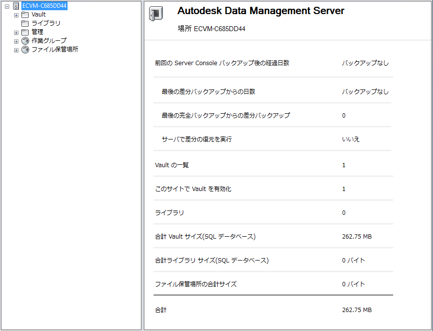 前回の Server Console バックアップ後の経過日数、有効になっている Vault の数、ライブラリの数など、選択した Vault Server の詳細を表示します。
