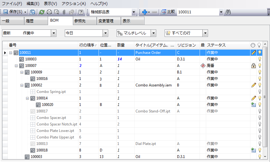 BOM を最適に管理するには、[BOM]タブのアイコンおよびステータスの設定を理解することが重要です。