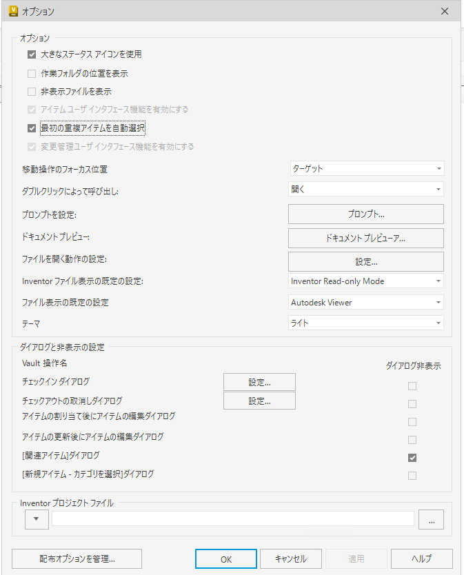 Vault スタンドアロン クライアントの[オプション]ダイアログ ボックスでは、特定のダイアログ ボックスおよびプロンプトを非表示にして、ワークフローをカスタマイズおよび合理化することができます。