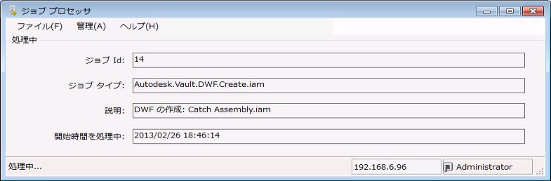 Job Processor は、キューに保存されているジョブを予約し、ジョブ サーバから取得して処理を実行する独立したアプリケーションです。Job Processor は Vault Client とともにインストールされるので、Autodesk Vault のエディションが搭載されているどのワークステーションでもジョブをパブリッシュすることができます。
