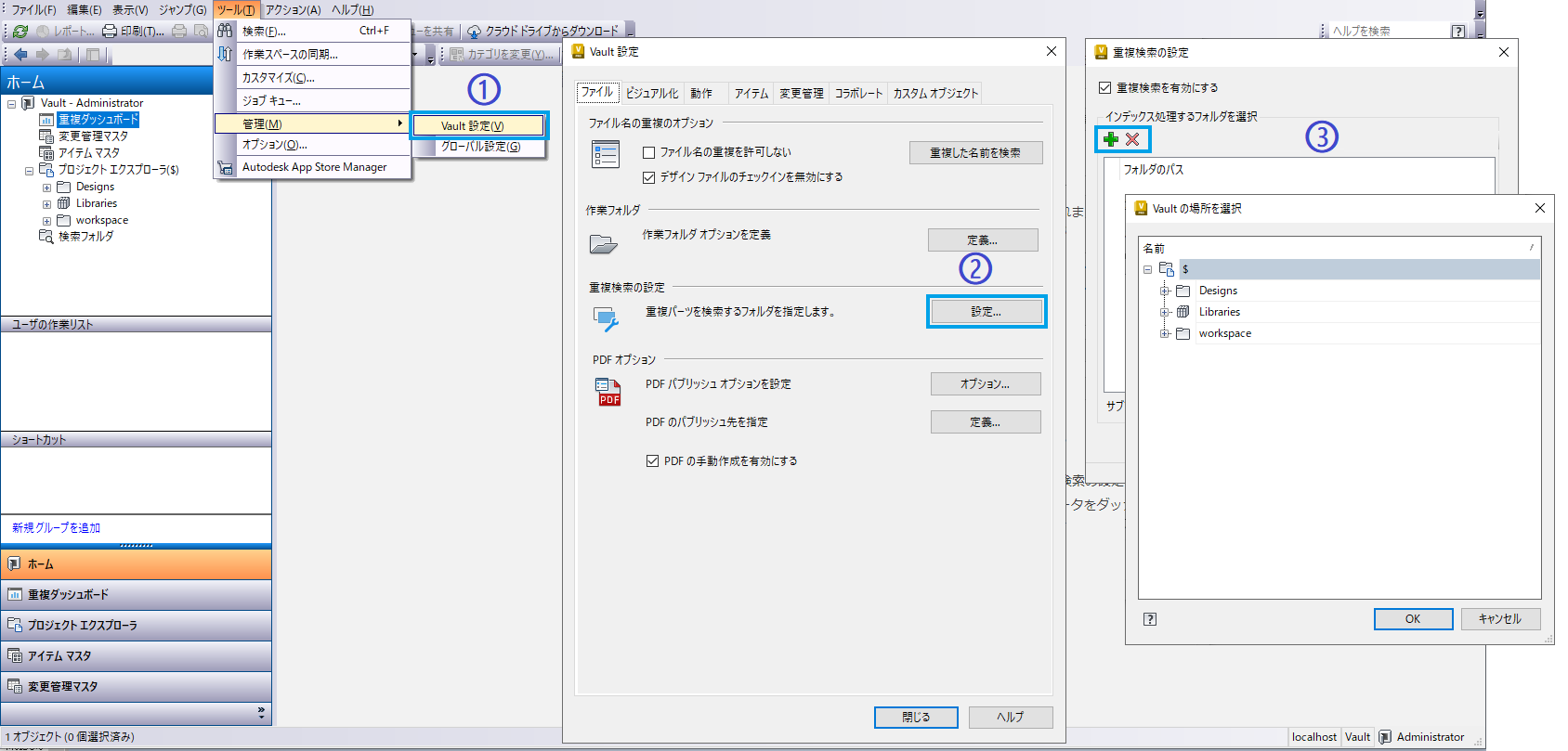 [Vault 設定]ダイアログ ボックスで、検索範囲を定義します。パーツのインデックスを作成するフォルダを指定します。