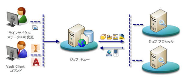 - ジョブ キュー: クライアント(inventor、autocad、vault、autoloader)から送信され、処理を待機しているジョブのリスト(キュー)です。このキューは、Vault Server によって保管および管理されます。