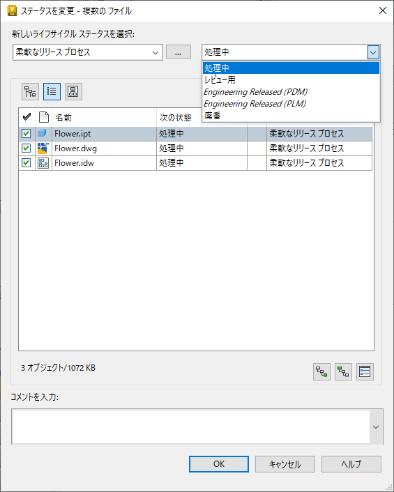 [カテゴリを変更]コマンドを使用すると、ファイル、フォルダ、アイテム、およびカスタム オブジェクトのライフサイクル ステータスを変更することができます。Vault オブジェクトのライフサイクル ステータスを変更すると、Vault 管理者が設定した特定のライフサイクルの動作が実行されます。ステータスには、[作業中]、[リリース済]、[廃番]などがあります。