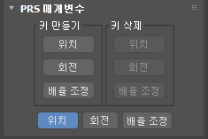 예를 들어 배율 조정 키가 포함된 프레임에 있는 경우 키가 이미 있으므로 만들기 열에서 배율 조정 버튼이 비활성화됩니다. 동시에 삭제할 해당 유형의 키가 없으므로 삭제 열에서 위치 및 회전 버튼이 비활성화됩니다.