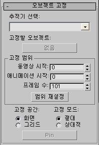 - 3ds Max 장면에서 고정 및 애니메이션에 사용할 오브젝트를 선택할 수 있습니다. 기본적으로 선택한 추적기와 연결된 추적 오브젝트가 이 옵션에 미리 로드되어 있습니다. 다른 오브젝트를 고정하려면 이 선택기를 사용할 수 있습니다.