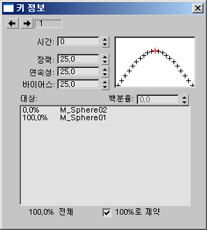 오브젝트의 모든 모프 대상과 현재 키에서 해당 영향력의 백분율을 나열합니다. 모든 대상의 총 백분율은 창 아래에 표시됩니다. 이 창에서 아무 대상이나 선택한 다음 오른쪽의 스피너를 사용하여 영향력의 백분율을 조정할 수 있습니다.
