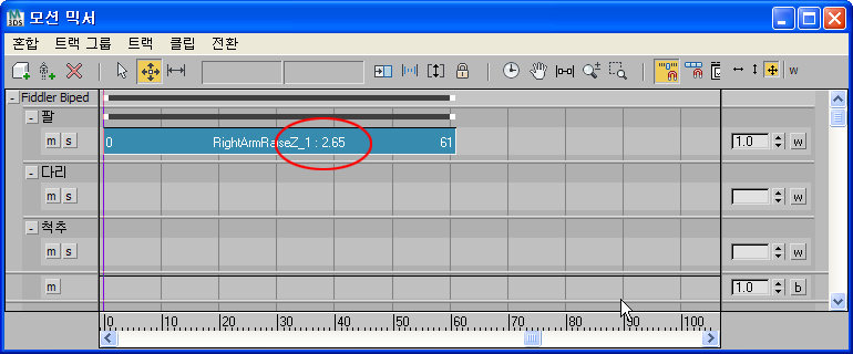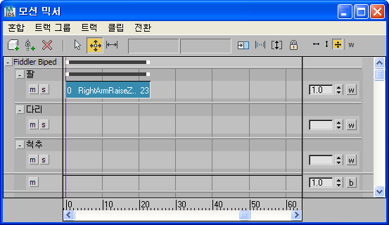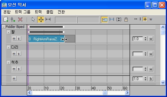 모션 믹서에서 클립을 단축하거나 트랙 표시 내의 타이밍을 대화식으로 변경할 수 있습니다.