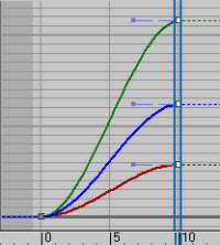 곡선은 프레임 10에서 둥글게 되지만 프레임 20 근처에서 곧게 펴집니다. 보간은 프레임 10의 자동 출력 접선에서 프레임 20의 선형 내부 접선으로 전환됩니다.