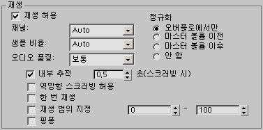이러한 옵션은 내보내기를 위해 렌더링된 오디오의 다양한 매개변수를 조정합니다. 이 오디오는 해당 오디오를 내보내 샘플로 다시 로드하지 않는 한 3ds Max에서 들을 수 없습니다. 이 섹션의 옵션 대부분은 재생 그룹의 동일 옵션과 기능이 같습니다. 이 섹션의 다른 옵션은 다음과 같습니다.