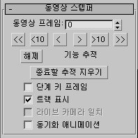 카메라 추적기 유틸리티의 동영상 스텝퍼 롤아웃은 추적 단계 중에 동영상을 검색하여 시작 및 중지 프레임을 설정하거나, 추적 결과를 검토하거나, 프레임 시퀀스에서 수동으로 트랙을 수행합니다. 동영상 스텝퍼 롤아웃은 프레임 카운터, 스테퍼 버튼 집합 및 일부 옵션 확인란으로 이루어져 있습니다.