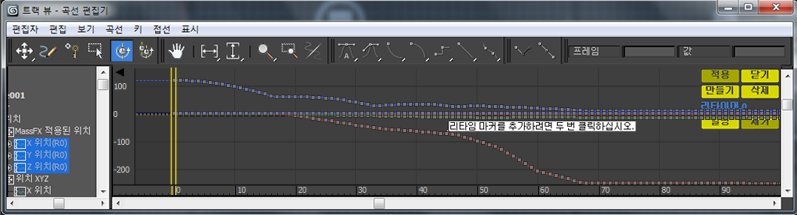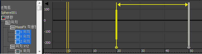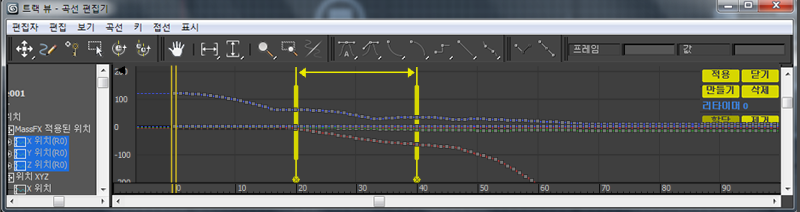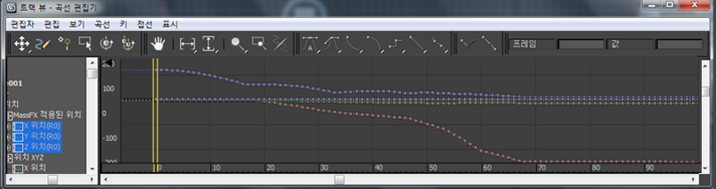 트랙 뷰는 곡선 편집기 모드로 열립니다. 선택한 오브젝트의 애니메이션된 트랙만 트랙 뷰 - 곡선 편집기의 계층 창에 강조 표시됩니다. 이것은 기본 동작입니다.
