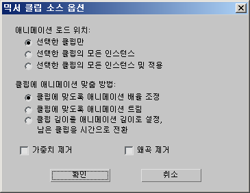 파일에서 클립 메뉴를 선택할 때 믹서 클립 소스 옵션 대화상자가 열립니다. 선택한 새 클립이 선택된 클립을 대체합니다. 인스턴스 및 선택 클립의 개조물을 대체하는 옵션도 있습니다.