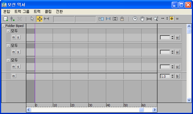 모션 믹서의 각 트랙은 트랙 그룹의 일부입니다. 각 트랙 그룹은 필터링할 수 있으므로 다른 부분이 아닌 몸체 부분 집합의 모션을 사용합니다. 예를 들어, 한 모션 파일의 팔 모션을 다른 모션 파일의 다리에서 사용하려는 경우가 있습니다. 이 목적을 위해 두 개의 별도 트랙 그룹이 필요합니다.