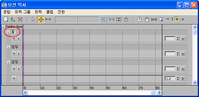 트랙 그룹이 작성되면 기본적으로 하나의 레이어 트랙이 지정됩니다. 그러나 각 트랙 그룹에 여러 트랙을 추가할 수 있으므로 각 몸체 부분 세트에 대한 모션 믹싱이 가능합니다. 예를 들어 팔에 대한 트랙 그룹을 작성하고 이 트랙 그룹 내에 두 개의 트랙을 만들 수 있습니다. 그런 다음 각 트랙에 완전히 다른 모션 세트를 배치하여 모션 중 다른 시간에 한 트랙 또는 다른 트랙의 가중치를 사용할 수 있습니다. 트랙 가중치 조정을 참조하십시오.