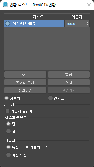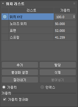 설정되면 리스트에 있는 모든 제어기 가중치 값의 평균을 구합니다. 변환 리스트, 위치 리스트 및 배율 조정 리스트 제어기에만 사용할 수 있습니다. 기본적으로 해제되어 있습니다.