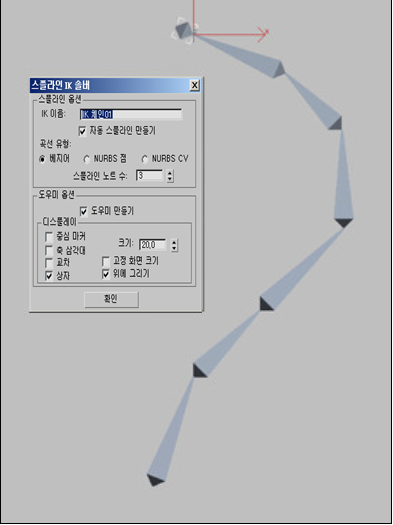 이 절차에서는 대화상자의 선택 항목을 기준으로 자동으로 스플라인을 그리고 이 스플라인에서 작동하도록 스플라인 IK 시스템을 설정합니다. 3ds Max에서 루트 골격에 경로 제약 조건이 자동으로 할당되어 스플라인 끝의 도우미/정점으로 제한됩니다.