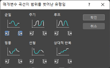 매개변수 곡선이 범위를 벗어난 유형임 대화상자에서는 애니메이션을 반복할 4가지 방법 및 선형 값을 적용할 2가지 방법을 제공합니다.