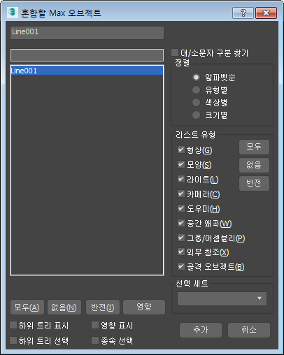 모든 Biped가 아닌 오브젝트를 장면에 표시하는 혼합할 Max 오브젝트 대화상자를 엽니다. 이 대화상자에서는 혼합된 애니메이션에서 사용할 오브젝트를 추가할 수 있으며 오브젝트가 포함된 믹스의 이름을 지정할 수 있습니다.