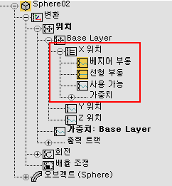 애니메이션 레이어를 활성화하면 전체 제어기 이름이 변경되므로 이 경우 다시 매핑해야 합니다. 예를 들어 애니메이션 레이어를 활성화하기 전에 구의 X 위치 트랙이 Sphere01₩Transform₩Position₩X Position이면 애니메이션 레이어를 활성화한 후 Sphere01₩Transform₩Position₩기본 레이어₩X Position(레이어 이름이 제어기 이름에 삽입됨)으로 변경될 수 있습니다.