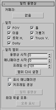 - 3ds Max 뷰포트 표시 여부 및 동영상 창이 프레임 단위로 업데이트되어 일치 결과를 표시할지 여부를 제어합니다. 이러한 표시 업데이트는 시간이 오래 걸리므로 이 옵션을 해제하고 트랙 뷰에서 카메라 함수 곡선을 보거나 일치 후에 3ds Max 애니메이션을 한 번에 한 프레임씩 단계별로 실행하여 일치 결과를 검토하는 것이 좋을 수도 있습니다.