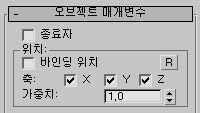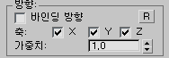 가중 및 축에 따른 결합 컨트롤을 이용하여 각 결합에 다른 가중치를 생성하고 bound 따르기 오브젝트가 어떤 축에 영향을 주는지 명시합니다. R(Relative) 버튼을 사용하여 위치 바인딩 및 방향 바인딩으로 상대적 간격띄우기를 설정합니다.