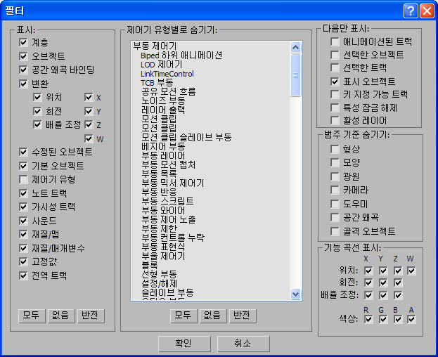 필터 대화상자를 사용하여 트랙 뷰에 표시할 대상을 선택할 수 있습니다. 예를 들어 애니메이션된 트랙만으로 또는 선택한 오브젝트에 대한 트랙으로 뷰를 제한할 수 있습니다. 또한 이 대화상자는 위치, 회전, 배율 조정 및 X, Y, Z 축에 대해 각각 함수 곡선 표시 및 변환 표시를 제어합니다.