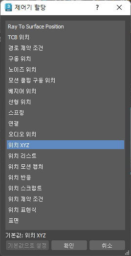 - 사용 가능한 제어기 리스트에서 선택합니다. 제어기 할당 대화상자에서 강조 표시한 트랙의 유형에 따라 구성원이 달라지는 여러 유형의 제어기의 하위 세트를 나열합니다. 예를 들어, 회전 트랙에는 회전 제어기만 사용할 수 있습니다.