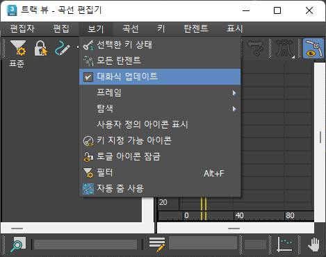 경우에 따라 트랙 뷰가 열린 상태에서 키를 편집하지 않고 애니메이션을 재생하거나 시간 슬라이더를 드래그하기만 하면 성능 문제가 발생할 수 있습니다. 이러한 문제가 발생한 경우 대화식 업데이트가 켜져 있으면 이 옵션을 꺼서 재생 성능을 향상시키십시오.