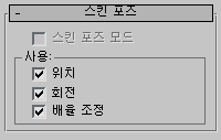 위치, 회전 및 배율 조정 확인란을 토글하여 스킨 포즈 모드가 활성일 때 해당 변환의 기록을 사용하거나 사용하지 않도록 설정합니다.